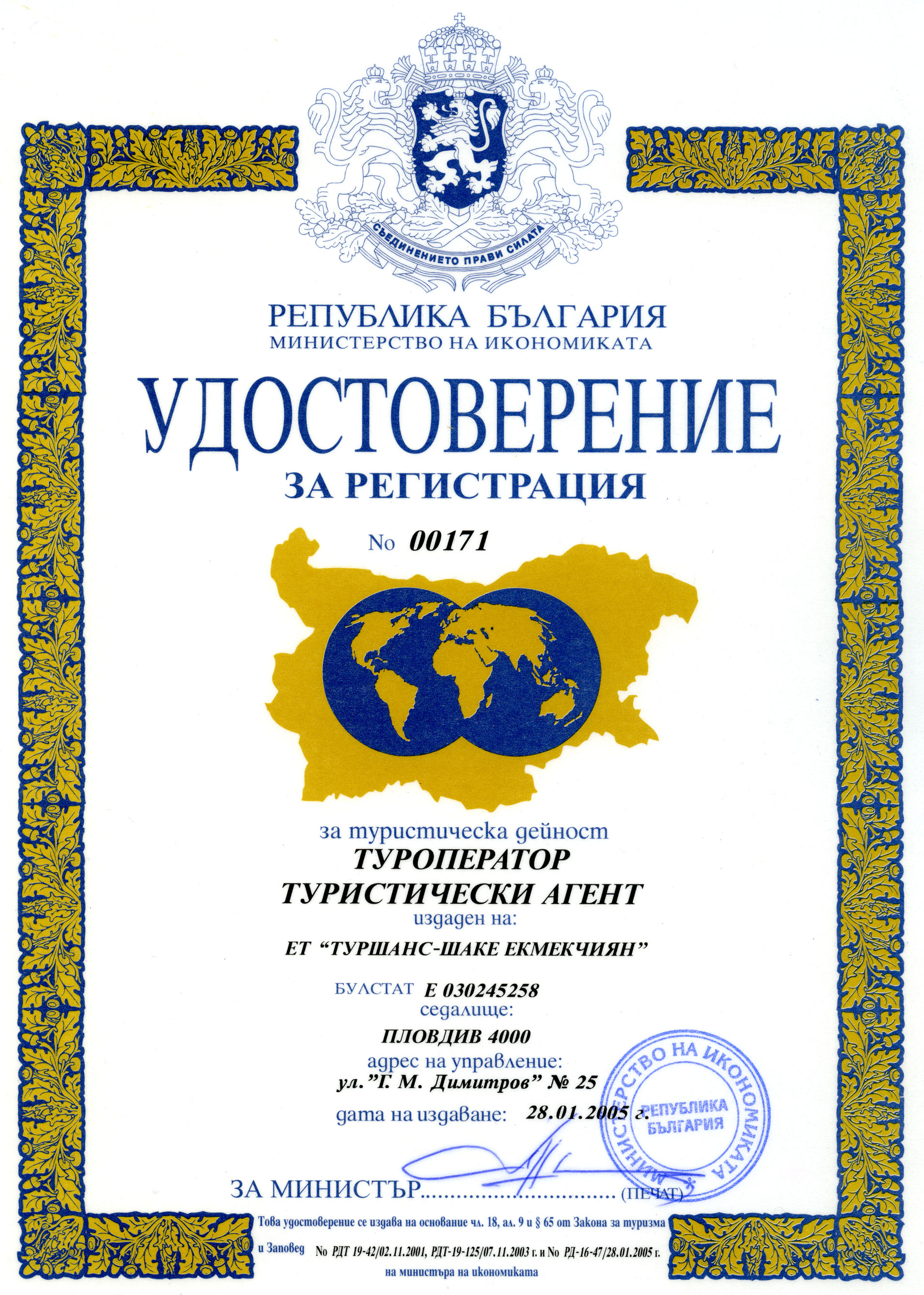 УДОСТОВЕРЕНИЕ ЗА РЕГИСТРАЦИЯ ТУРОПЕРАТОР И ТУРИСТИЧЕСКИ АГЕНТ N 00171 / 28.01.2005