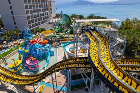 Аквапарк с 2 басейна, 7 водни пързалки за възрастни, 5 водни пързалки за деца, центрофуга и водни съоръжения за най-малките.