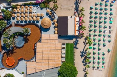 Собствен, пясъчен. Чадъри и шезлонги при басейна и на плажа - безплатно. Плажни кърпи срещу депозит.